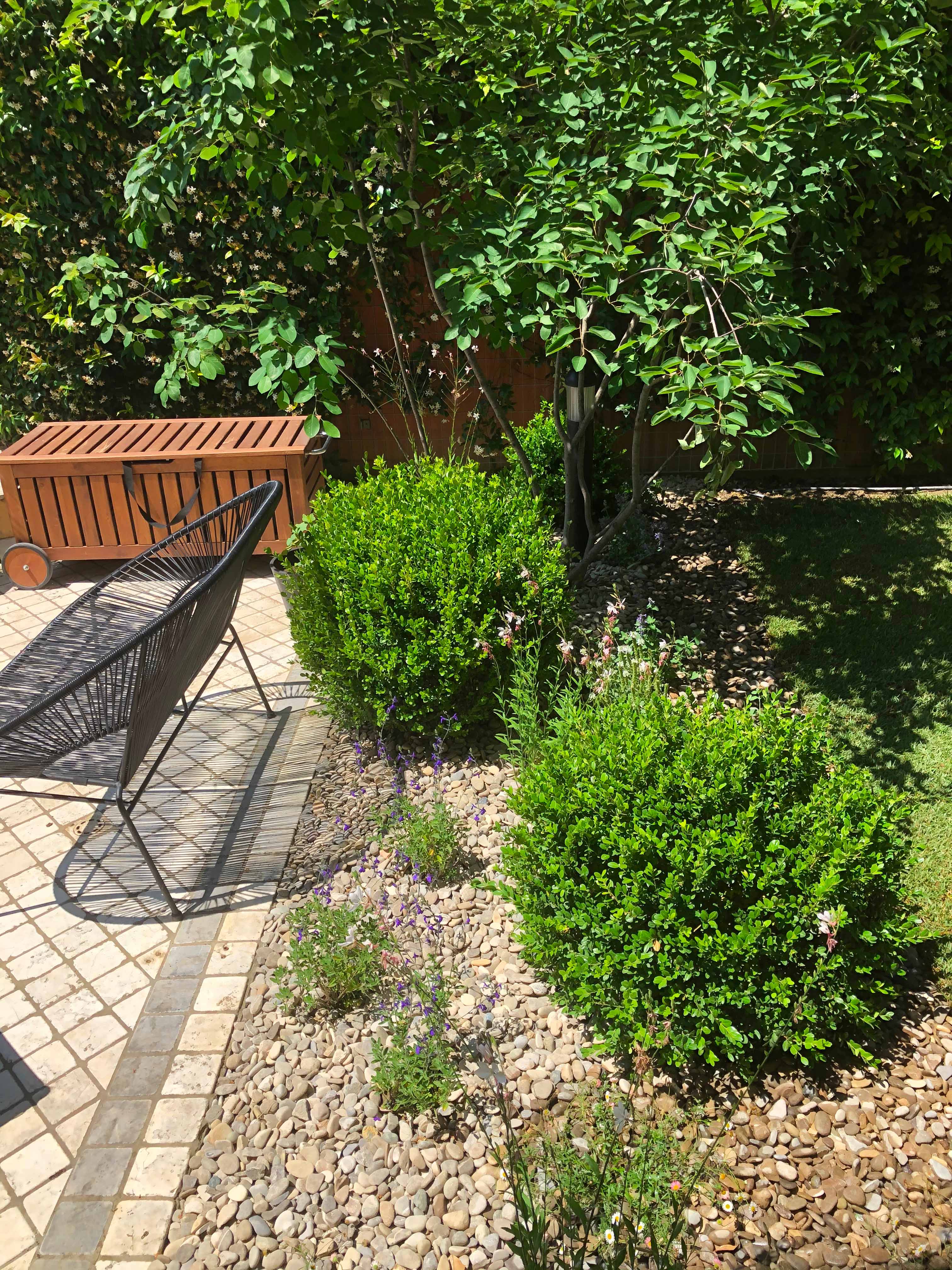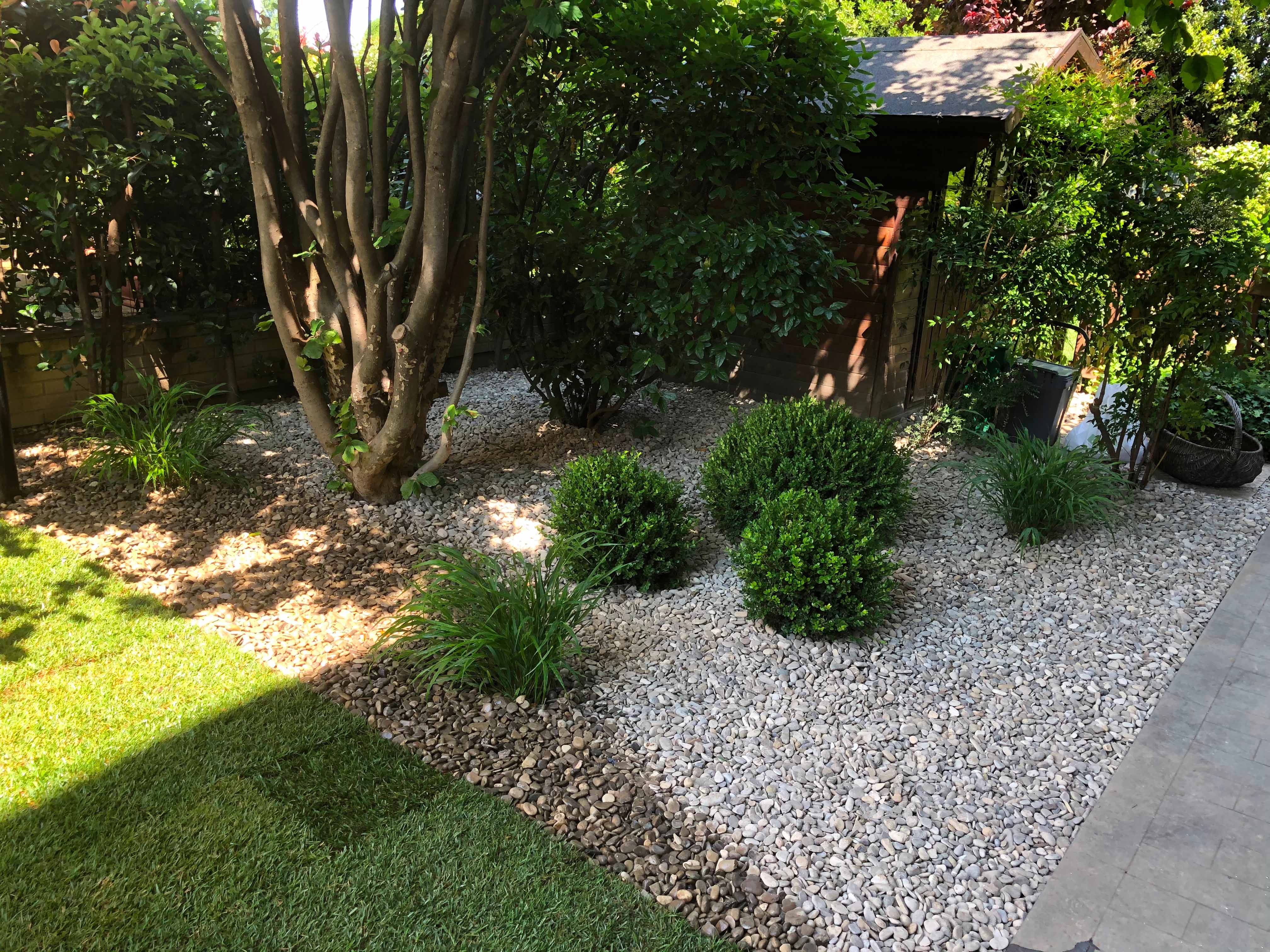 Creazione di aiuole in ghiaia, con erbacee perenni, fioriture e bossi a sfera
